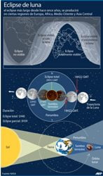 Este eclipse tendrá una duración de 100 minutos e iniciará a las 17h24 GMT y seguirá hasta alrededor de las 23h00 GMT, aunque la fase de eclipse total se producirá de 19h22 a 21h02 GMT, según el especialista de la NASA, Fred Espenak.