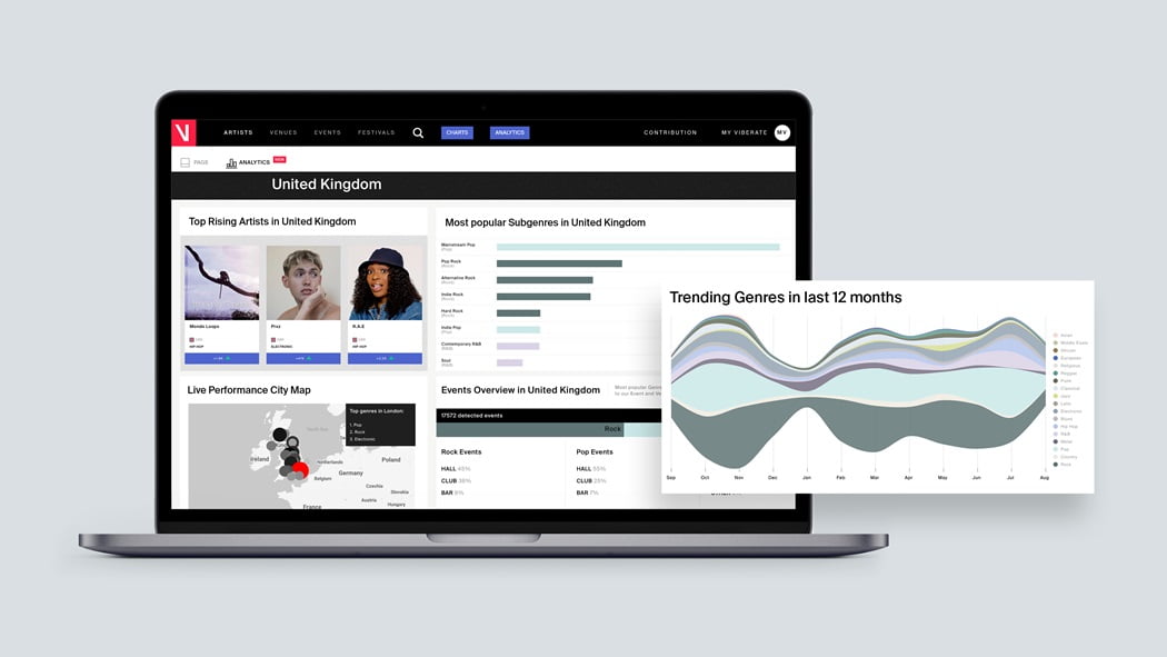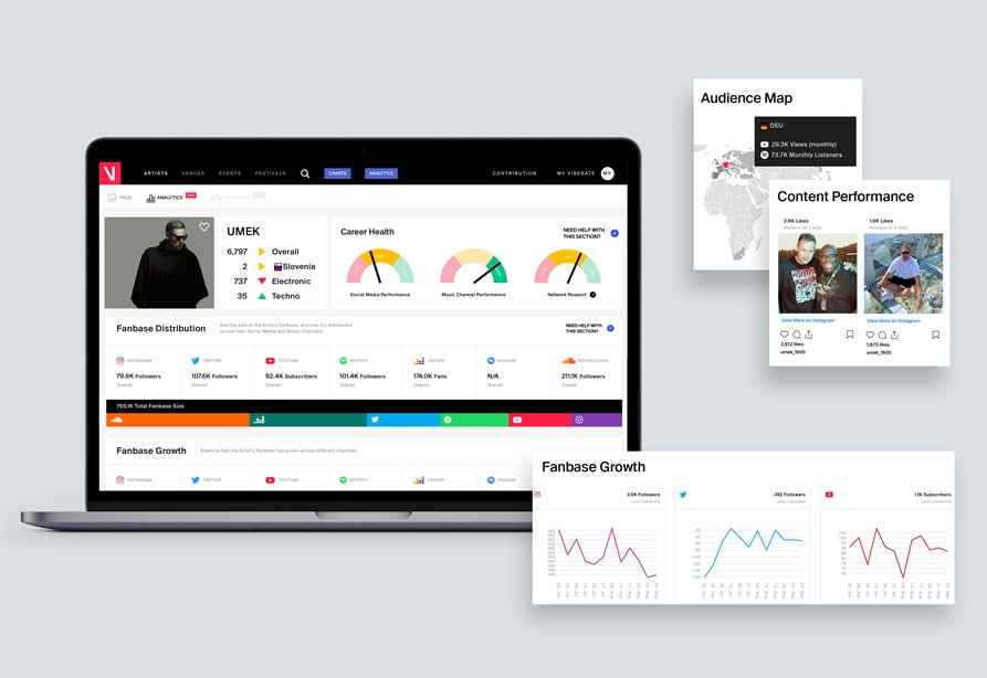 Los análisis de Viberate convierten los datos musicales precisos en información clara y poderosa para cualquier artista o profesional de la música del mundo. La herramienta recopila y examina las importantes métricas sociales y de transmisión de más de 450.000 artistas, presentándolas como información comprensible sobre géneros, países y bases de fans en todo el mundo. “Una vieja regla de la industria dice que se necesita talento, trabajo duro y suerte para tener éxito”, explica UMEK, “pero decidimos reemplazar la suerte con la información correcta. Nuestros datos brindan eso”.