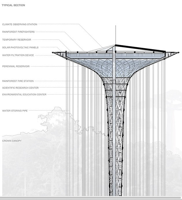Diseñado por los chinos Jie Huang, Jin Wei, Qiaowan Tang, Yiwei Yu y Zhe Hao, este proyecto arquitectónico es mucho más que un rascacielos convencional, ya que podría almacenar agua y regar la zona de selva circundante durante la estación seca o protegerla de incendios, según la revista ‘eVolo’.