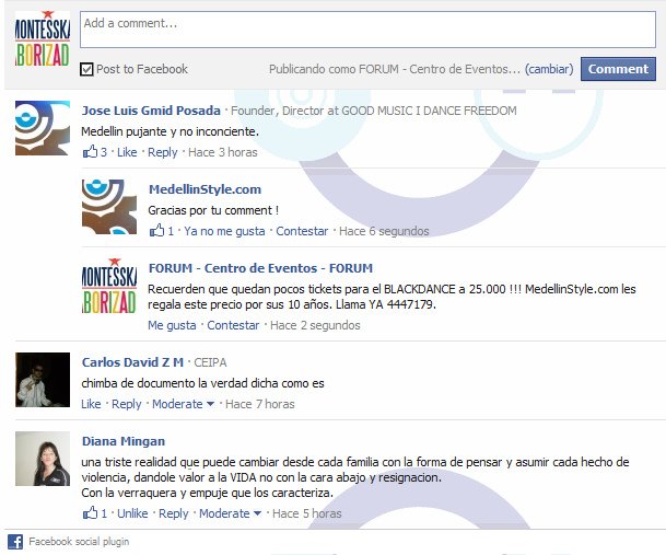 Una de las principales ventajas es que muestra los comentarios al mismo tiempo que en Facebook y además, en la página de fans de MedellinStyle en Facebook.