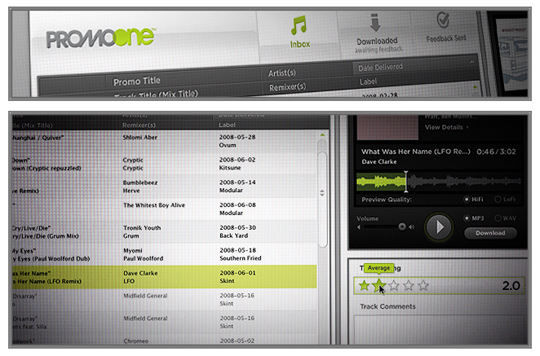 Con una interface similar a la tienda online Beatport, con PromoOne simplemente los sellos/productores deberán subir los tracks a su cuenta y de una manera fácil y atractiva podrán enviar las promos a más de 1000 DJs, con nombres de la talla de Pete Tong, Sasha, Carl Cox, Steve Bug, Loco Dice, Josh Wink, 2ManyDJs o David Guetta. Los sellos también podrán ver los feedbacks y la puntuación de cada tema descargado (será obligatorio para poder descargar un tema).