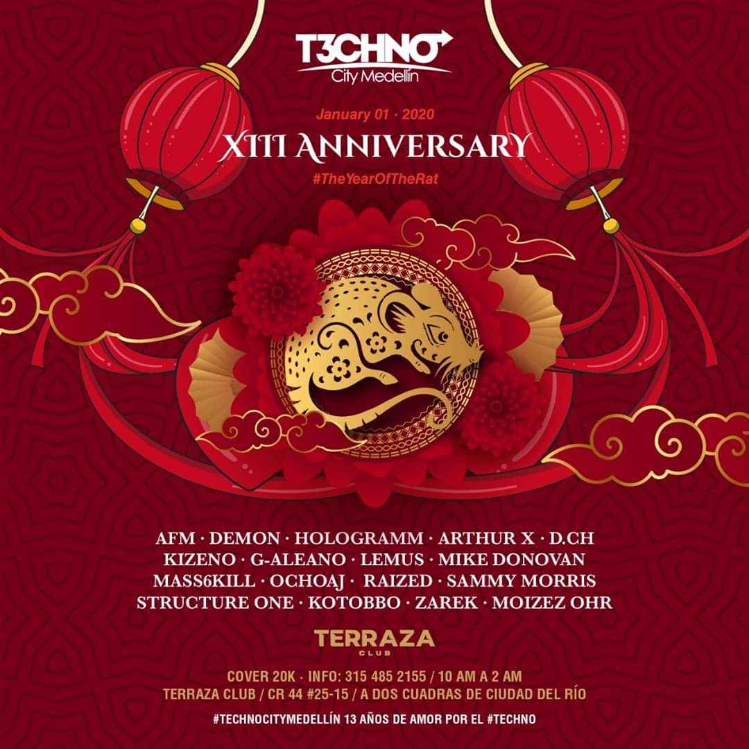El colectivo Techno City Medellín celebrará este próximo 1ro de enero desde las 10 am en Terraza Club su 13º aniversario dedicado a la realización de eventos de música electrónica de baile; y en esta ocasión lo harán con toda su crew: Afm, Demon, Hologramm, ArthurX, Dch, Kizeno, Galeano, Lemus, Mike Donovann, Mass6kill, OchoaJ, Raized, Sammy Morris, Structure One, Kotobbo, Zarek & Moises Ohr